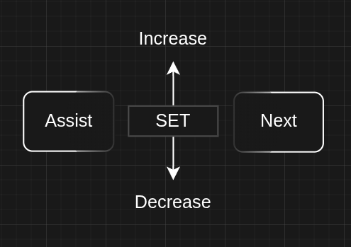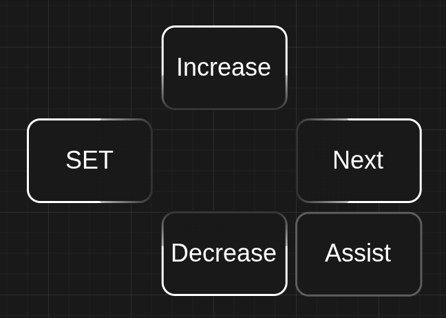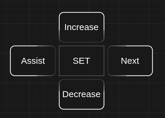 Cancelbutton when any dialogs are pending confirmation. - Assist - Toggles additional assists on or off, this is usually the lane assist. Should not update current speed. That is done using the SET key.